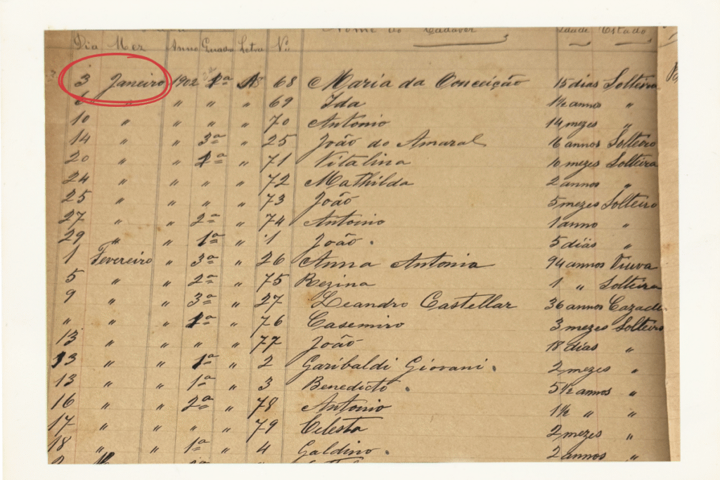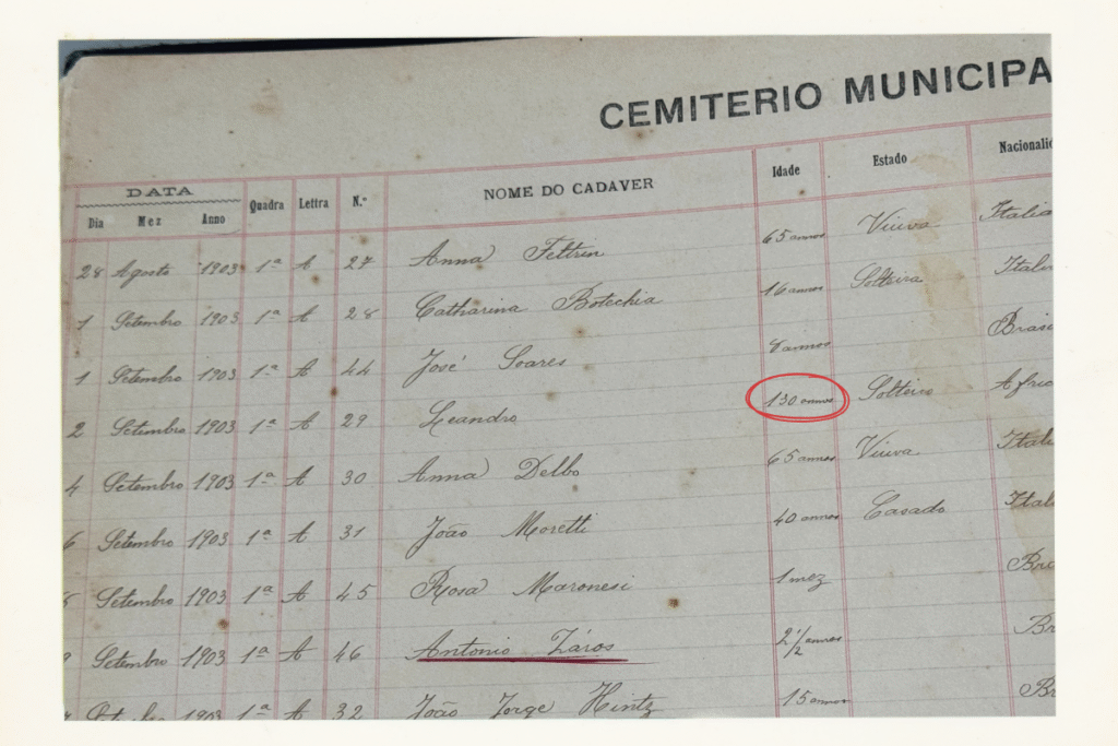 2 de setembro de 1903 – Leandro, o africano do Cemitério de Cascalho, com 130 anos – o registro mais longevo encontrado.