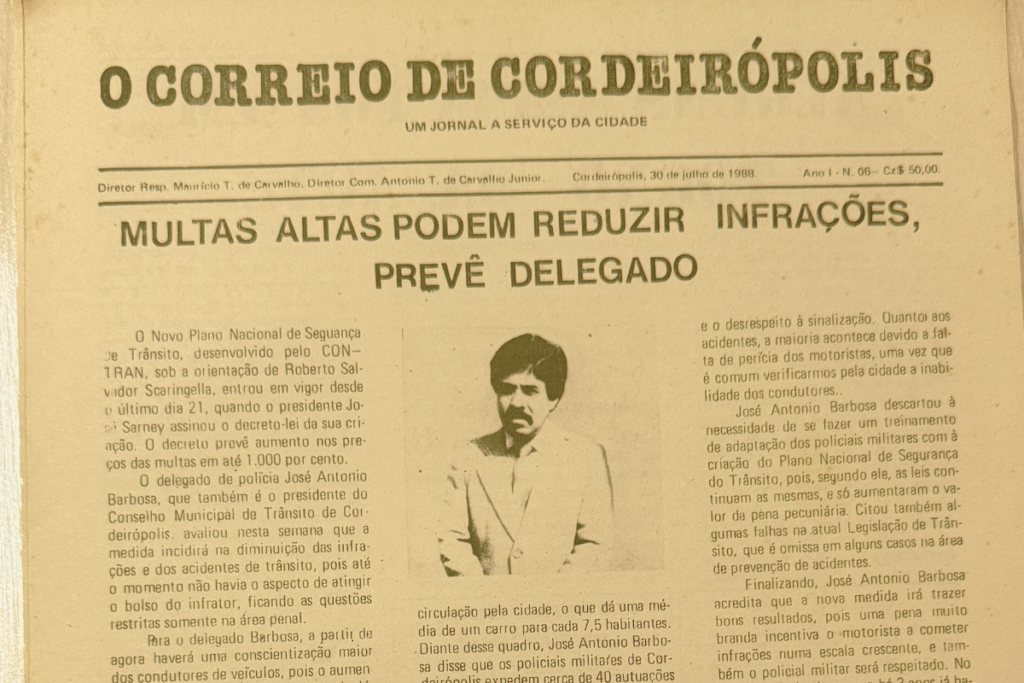 Em 30 de julho de 1988, O Correio de Cordeirópolis chegava às ruas com um claro recado: quem comandava o jornal era a política. E isso fica evidente logo na capa da edição. Várias matérias e entre elas giravam em torno de quem tinha maior destaque na cidade:a Segurança Pública e o legado dos família Levy. Multas, caos no trânsito e o início da era da punição “Multas altas podem reduzir infrações, prevê delegado.” Foi assim a manchete que o delegado José Antônio Barbosa se posicionava: para acabar com desrespeito e acidentes, teria que doer no bolso.Ele dizia que o aumento das autuações fazia parte de um novo plano nacional e que, em Cordeirópolis, o trânsito já dava sinais de preocupação: A cidade ganhava mais carros do que estrutura e o jornal tratava o tema como alerta, mas também como apoio às medidas do governo federal. Aqui, o jornal assumia seu tradicional papel da época: ser a voz das autoridades. Cássio de Freitas Levy: de político a “patrimônio” A reportagem interna afirmava sem hesitar: “Cássio de Freitas Levy: um patrimônio da cidade” Não era apenas uma matéria. Era uma homenagem completa ao ex-prefeito que governou duas vezes e tinha forte ligação com o desenvolvimento econômico da cidade. Sua história foi contada como a de um herói local: O texto não escondia seu lado: era elogio atrás de elogio. É a prova viva de como o jornal local dos anos 80 funcionava junto a quem estava no destaque da cidade. Uma cidade em crescimento e disputa O restante da edição mostra outros cenários de uma Cordeirópolis que se transformava: Era a cidade vivendo sua rotina, enquanto o jornal registrava aquilo que queria que ficasse para a história. Crítica histórica: o jornal como ferramenta de influência Ao analisar a edição hoje, o que mais chama atenção é a proximidade do jornal com os poderosos.A linguagem é respeitosa, institucional, cheia de adjetivos e sem questionamentos. No papel, o povo aparecia mais nas propagandas do que nos textos. O jornal narrava o que a cidade via, mas a visão de quem mandava. Memória viva de um tempo político Rever essas páginas é entender: Naquele momento… A comunicação não era só notícia. Era poder. Era imagem. Era influência. Agora, décadas depois, esse jornal vira documento histórico.Ele revela como Cordeirópolis negociava suas prioridades e sua identidade. E revela, também, o quanto a imprensa mudou. 📍 Fonte: O Correio de Cordeirópolis – Edição de 30 de julho de 1988📚 Acervo Digital – Projeto Tá no Arquivo